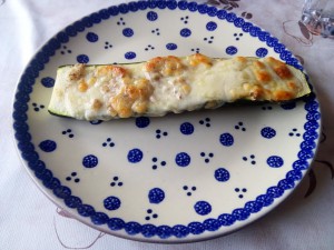 なにやらズッキーニをくり抜いてそこにナッツなんだかを詰めて、ついでにモッツァレラチーズを乗っけたらしい。で、オーブンにぶち込んで…