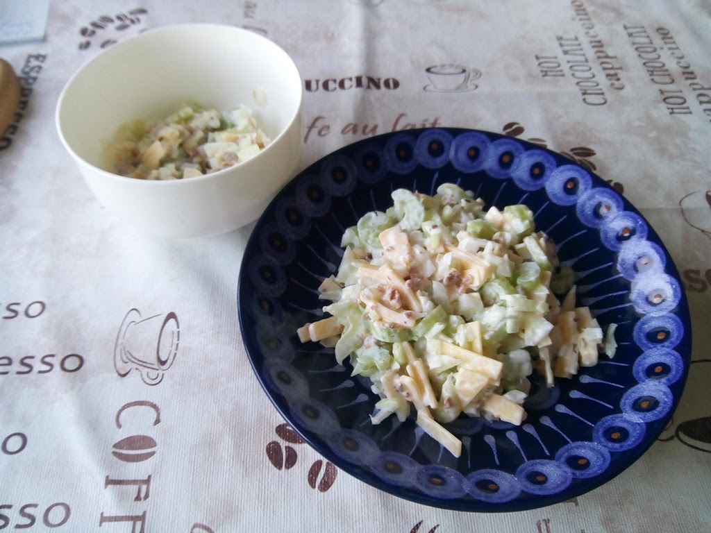 再びサラダ。今度はセロリが中心でヨーグルトか何かのドレッシングがけっこうかかっている。そのかわり、チーズが混ざっているせいもあってか月曜日のに比べると全体の量が少ない。セロリってけっこう独特の味があるよね…。