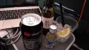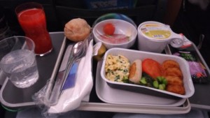 離陸後、飲み物のサービス。ナッツと「食事中を含めた」飲み物を選ぶように言われる。つまり、食事前に飲み物の御用聞きに来てくれない。ナッツは袋に入ったままで暖められていない。本当に細かいことだけど、ビジネスクラス席との越えられない壁を感じる。