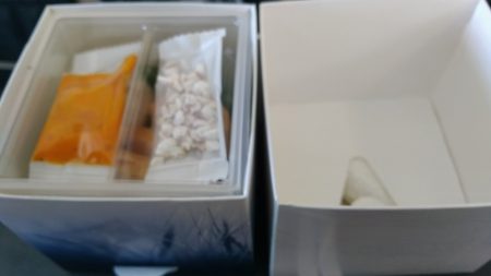 なんか偉そうな口上が書いてますが、そっちに目を取られてはいけない。写真右の蓋の裏にナイフとフォークが入ってるのです。使い捨てのプラスチック製。ルフトハンザとの格の差がこんなところにも出てます(…あ…ついと本音が…)。