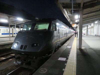 舞台は戻って早朝6時過ぎの佐伯駅のホーム。どう見てもつばめ型の特急列車が入線してます。787型車両。私がまだ大分に住んでいた頃(つまり90年代初頭)にさっそうとJR九州に登場した花形車両でした。思えばそれから25年も経っているので、いい加減くたびれ果てた車両になってますが、それでも特急。これが午前6時18分発、日豊本線下り、本日の始発かつ終電の各駅停車延岡行きです。